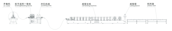 開(kāi)卷機(jī)---較平一體機(jī)---沖孔----成型機(jī)組----成型剪-----放料架