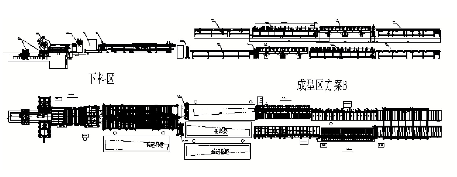 2 該生產(chǎn)線能生產(chǎn)多種板寬、截面、長度的頂板,更換規(guī)格時需調(diào)整縱橫剪角度、沖缺口模具和切端頭擋料僅需調(diào)整相對位置,真空吸盤和翻邊壓料塊需根據(jù)板型不同做相應(yīng)更換,集中沖孔則需要根據(jù)板型的不同,調(diào)整個別沖孔機(jī),無需全部調(diào)整。通過以上操作,便可實(shí)現(xiàn)多種板型的生產(chǎn)。